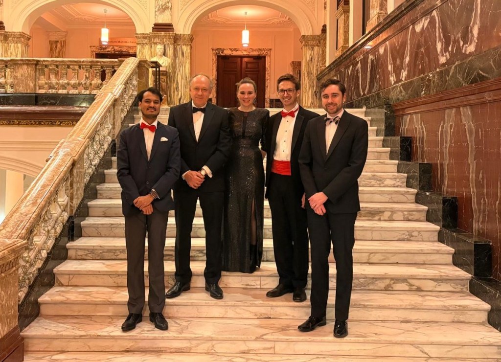 The committee at the 2025 Annual Dinner (left to right): Vidit, Nick (outgoing president) , Ruth, Clym, Stephen